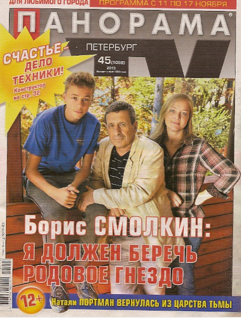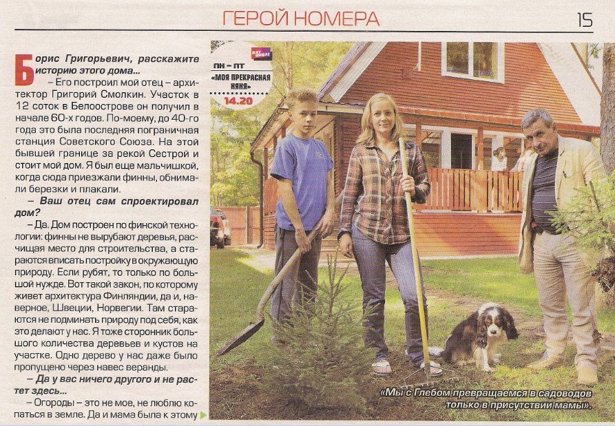 В журнале "Панорама-ТВ" № 45 (с программой ТВ на 11-17.11.2013) героем этого номера стал артист Борис Смолкин. В материале "Я должен беречь родовое гнездо" речь шла о дачном участке в Белоострове, дом на котором построил его отец - архитектор Григорий Смолкин.