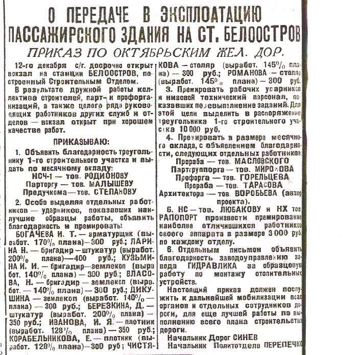 В начале ноября 1934г. на совещании строительного отдела Окт. ж. д. его начальник сообщил, что вокзал должен быть предъявлен комиссии к сдаче в конце декабря. Также он обязал переключить весь аппарат строительного участка и все ресурсы материальные и по рабсиле, за счет других работ, на строительство белоостровского вокзала.