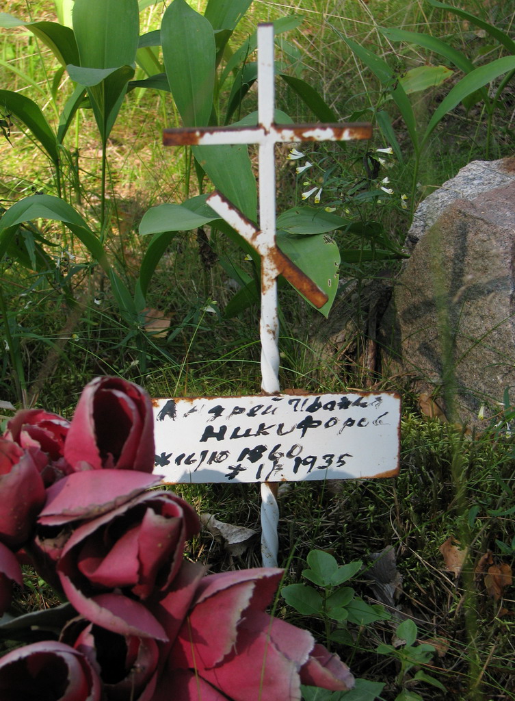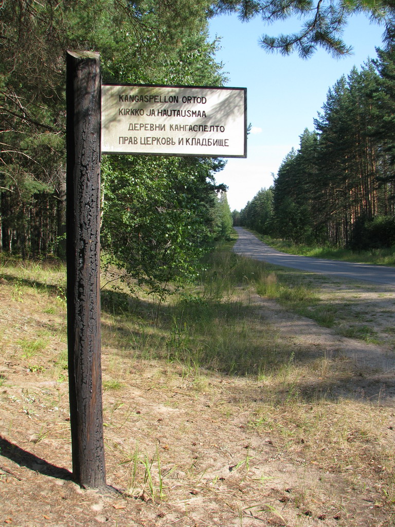 Если проехать по ужаснейшему старому Выборгскому шоссе за Красносельское в сторону Стрельцово, то по правой руке будет место, где находилась православная церковь бывшей деревни Кангаспельто. Это было русское поселение, там жили люди с фамилиями Фомин и Никифоров ещё в 1930-е годы. Церковь появилась там в 1921 году, когда её перенесли из Каннельярви на средства купца Шилова. В Каннельярви же она стояла с 1906 года. Шилов был и настоятелем, насколько я понял. За церковью располагалось кладбище, от которого осталось несколько старых могил. Одна из них принадлежит Наталье Ивановне Шиловой. Интересно, что памятники выполнены из грубого бетона, но формой напоминают классические гранитные надгробия. Церковь сгорела в Зимнюю войну. Финны, как водится, установили крест и памятную табличку. Русские власти, как водится, не отметились ничем, кроме поганой дороги.