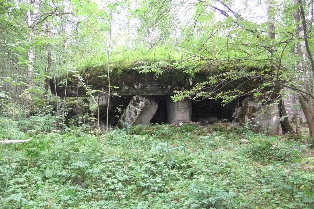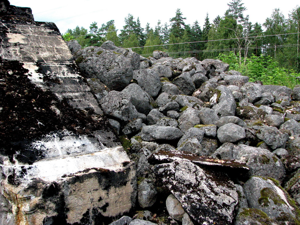 Для сокращения пути ехали по "Скандинавии" до поворота на Стрельцово, а потом - по В.-Выборгскому шоссе в обратном направлении. Первая "свёртка" - на грунтовку, идущую на Вещёво. Указателя нет, вместо него - только фанерная стрелка с надписью: "ф/х "Ильвес". Здесь остановились, чтобы найти первый из намеченных ДОТов - Mu16. Однако вместо ДОТа сначала попался непонятного назаначения объект, скорее недостроенный, чем разрушенный и отсутствующий на картах. Потом уже, после консультаций на дружественном сайте выяснилось, что это действительно недостроенное укрытие л/c. И вообще этот участок укрепузла был закончен перед Зимней войной и, не будучи отраженным в известном альбоме разведотдела штаба ЛВО, стал одним из сюрпризов для Красной Армии. Проехав буквально сто метров по дороге в сторону Ильвес, нашли и осмотрели Mu16, а проехав ещё подальше - Mu17. Оба, естественно, взорванные, но не до конца . Mu16 - относительно чистый, помечен ИКО "Карелия". Mu17 завален со всех сторон и внутри мусором, что не удивительно: стоит практически на дороге, рядом ЛЭП и газо (нефте?)провод, в общем - проходной двор Наибольшее впечатление во всех смыслах получили от Mu19, расположенного прямо под ЛЭП (уже другой), в месте пересечения её скотопрогонной дорогой, отходящей от ф/х "Ильвес. Он и стоит красиво, считай - в чистом поле, и взорван тоже "аккуратно": крыша слегка вспучена, посредине - дыра, окантованная вставшей дыбом арматурой, с крыши открывается вид на стоящий метрах в 500-х ДОТ Mu15, и кой-какие железки, насмерть вмурованные в стены, ещё сохранились. Идти до Mu15 было как-то лениво . с Позже, изучив карты, поняли что гораздо ближе, чем Mu15, у кромки леса расположен ДОТ Mu14. Впрочем, для такой легкомысленной прогулки и вышеперечисленного вполне хватило. Кстати, вся эта компания есть на Викимапии, только Mu15 там почему-то обозван Mu14. А на баировской карте -явно описка! - Mu5, и таких там получается два. Тем не менее, приведённая здесь нумерации дана по карте Баира, выложенной на http://www.mannerheim-line.com/muolaa/muolaamapr.htm
