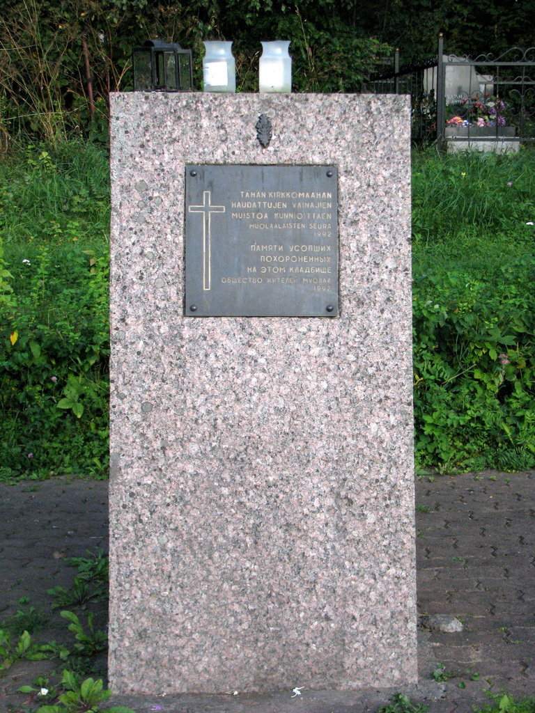 В Правдино ведёт совершенно безобразная дорога, не ремонтировавшаяся, по-моему, с советских времён . И сам посёлок производит довольно унылое впечатление. Глазу не на чем задержаться. Плывущий по воле волн, постепенно разваливающийся агросектор, порядком обветшавшие частные дома - некоторые явно ещё финского времени - кое-где соседствуют с "новорусскими" теремами из оцилиндрованного бревна, якобы асфальтированная дорога заканчивается на горке, там, где когда-то был центр Muolaan kirkkonkyla - кирха, волостная администрация, магазин, контора сбербанка, почта. Сегодня это просто голый, пыльный Т-образный перекресток, за которым в буйных зарослях скрываются развалины бывшей церковной стены, опоясывающей сегодня действующее кладбище, которое с трёх сторон окружает бывший церковный двор. Эта территория расчищена, на месте алтаря стоявшей здесь кирхи установлен большой крест, а справа по периметру сложены надгробные плиты прежнего лютеранского кладбища. Сохранились закладной фундаментный камень кирхи, датированный 1849 г., памятник финским белогвардейцам, погибшим в 1918 г., место братского захоронения погибших в 1939-44 гг, где также установлен в 19992 г. обелиск. От кирхи к озеру ведут лестницы, одна из которых частично уцелела.Раньше по этим лестницам поднимались к кирхе от лодочной пристани. Часть могил полностью скрыта кустарником, кое-где брошены вывороченные безымянные надгробия, всё, что было металлического - давно срезано. В общем, картина грустная и, увы, достаточно типичная.
