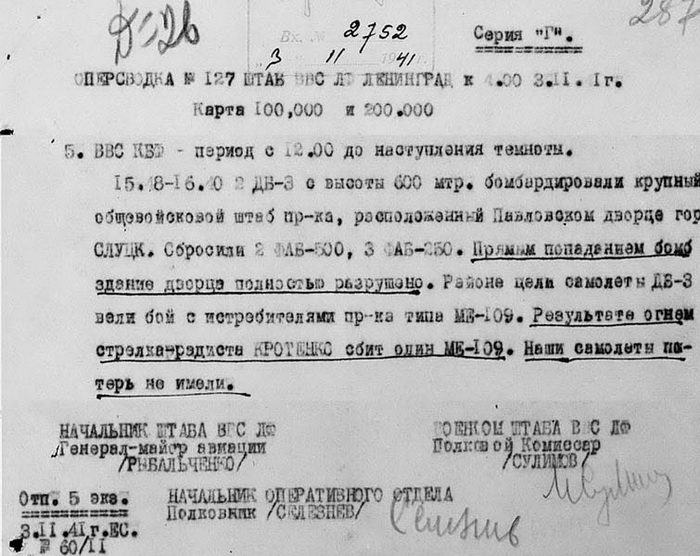 3 ноября 1941 года авиация Балтийского флота разрушила здание дворца, в котором находился штаб противника.