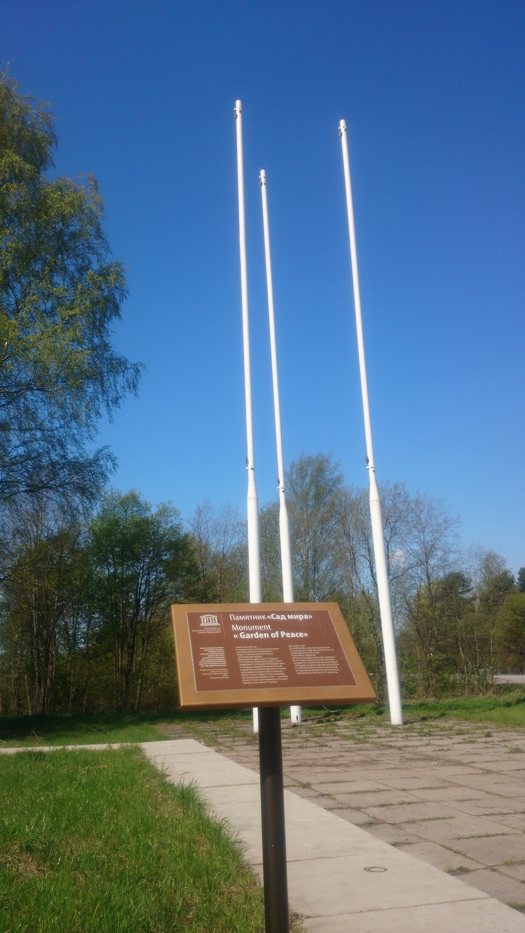 - Памятник "Сад мира". Это 9 мая! На флагштоках нет ни Знамени Победы, ни Знамени России, ни одного! Позор какой-то! В детстве, как помню, всегда 9-го мая водружали Красное Знамя или три знамени. Похоже, что официальных мероприятий не проводилось.