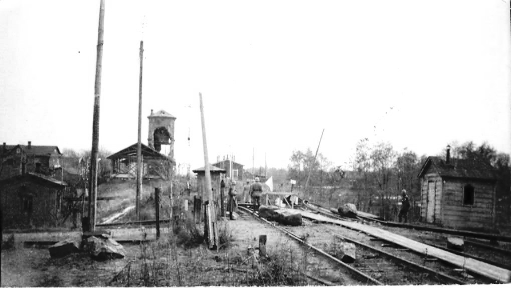 Предполагаю, то же время, пешеходный переходной мост. Цела водонапорная башня (наверху у нее было окошечко), снято с финской стороны.
