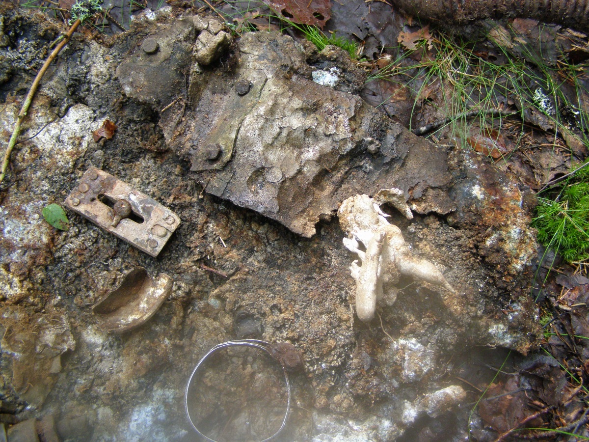 В День флота решили отметить "копом"на финских позициях близ М.Каллелово.С ходу начали натыкаться на множество кусков плавленного дюралюминия.При ближайшем рассмотрении в кусках сплава видны различные мелкие детали и пружинки.Так же были обнаружены фрагменты топливной системы с кусочками металлических и алюминиевых трубок.Еще были найдены металлические хомуты для фиксации резиновых патрубков.Так же найдена пружина диаметром30 мм и длиной около 0.5 м с фрагментом оплавленного куска дюрали с дверной петлей-но петля явно не от деревянной двери.Куски оплавленного алюминия(самый большой около 60 см в диаметре)были найдены в радиусе 50 м.Причем выкопали далеко не все.Гипотеза-на этом месте упал сбитый самолет.Большие части собрали трофейщики после окончания БД.
