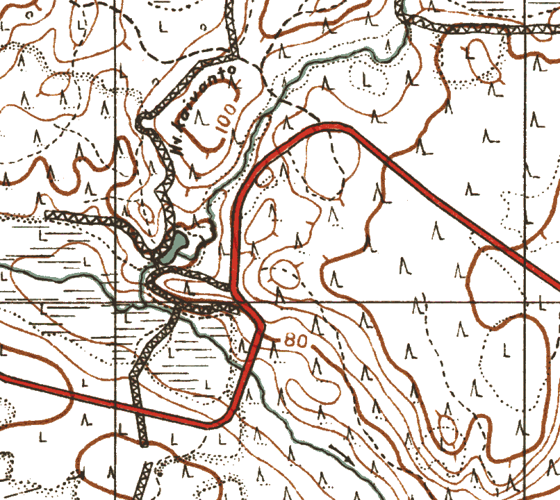 6. «Черепаха». Между «Измаилом» и дотом, изображенным на плане слева (см. п.5), т.е. перед г.Мертуть, есть ров идущий от карьеров с юго-запада на на северо-восток (я предполагаю, что план примерно ориентирован: верх – на север), пересекая Александровское шоссе. На какой стороне рва находилась «Черепаха». и как далеко от рва и от шоссе?