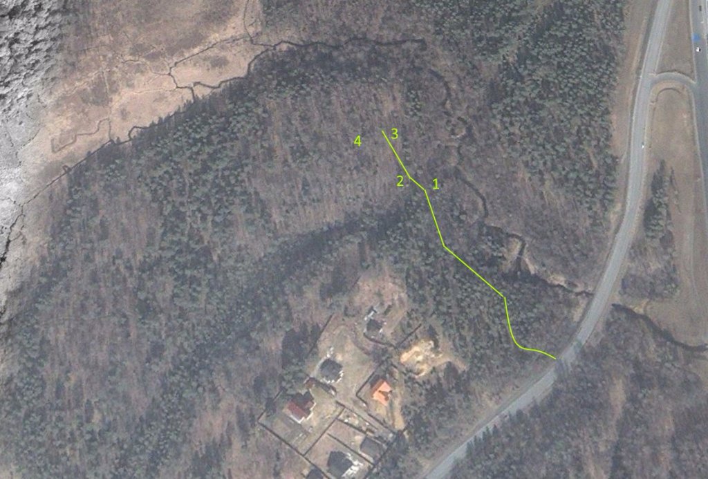 Были мы там 1 мая 2015 года. Если смотреть на схемку, то точка 1 это начало перехода болотца по мосткам. Точка 2 это начало тропы вверх (ну она там одна, как говорится - мимо не пройдешь). Точка 3 это окончание тропы на гребне высотки. Кость лежала прямо на поверхности на ровной площадке, не в окопе. Приблизительно в точке 4. Т.е. после подъема надо идти влево. От края обрыва метра 2-3. Какое расстояние не помню. Вроде как не далее 30-40 метров от точки 3. На фото, озаглавленном "Спуск",- это передвижение из точки 3 в точку 2. А вот не около ли кости был сделан предыдущий кадр (скриншот 24)?