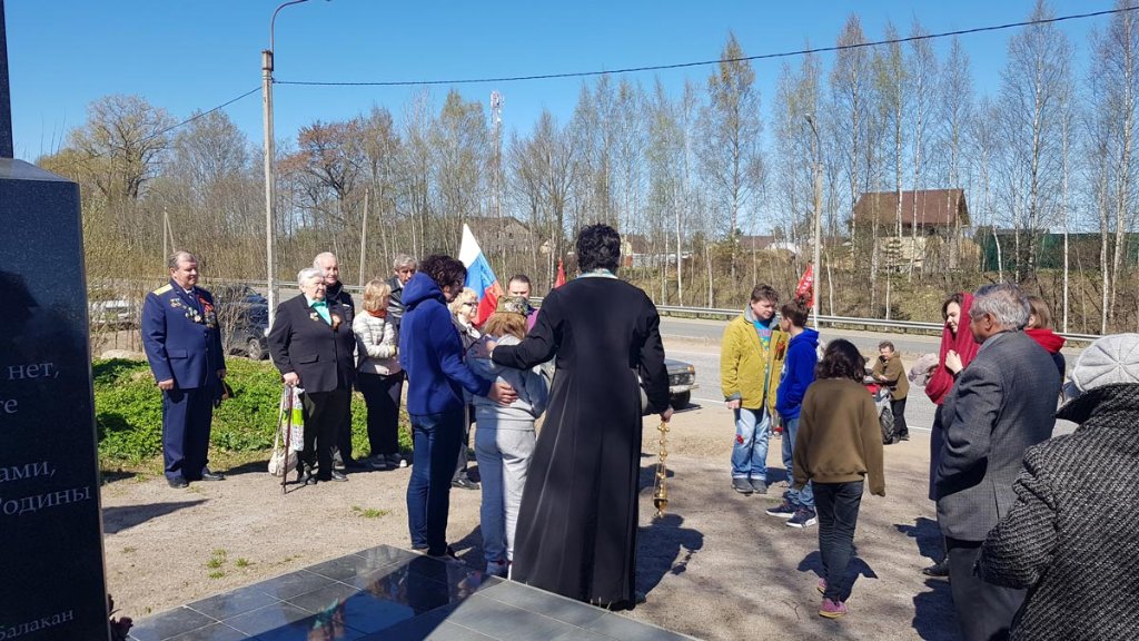 О.Сергий приехал с певчими, провел панихиду по летчикам и по всем павшим в войне; юная девочка прочитала стихи в честь праздника, пришедшие возложили цветы к памятнику, после чего все переместились к часовне.