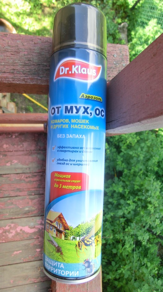 На последнем фото просто для информации (тиснул в объявления, ибо не знаю куда) средство от всяких винтокрылых. Действительно мощная струя метра на три, сшибающая практически осиное гнездо. Т.е. можно издали пшикнуть и убегать, намокает мгновенно. Для комаров и всяких мух лучше все-таки обычный дихлофос с распылением. А то расход топлива на одного комара будет огромный.