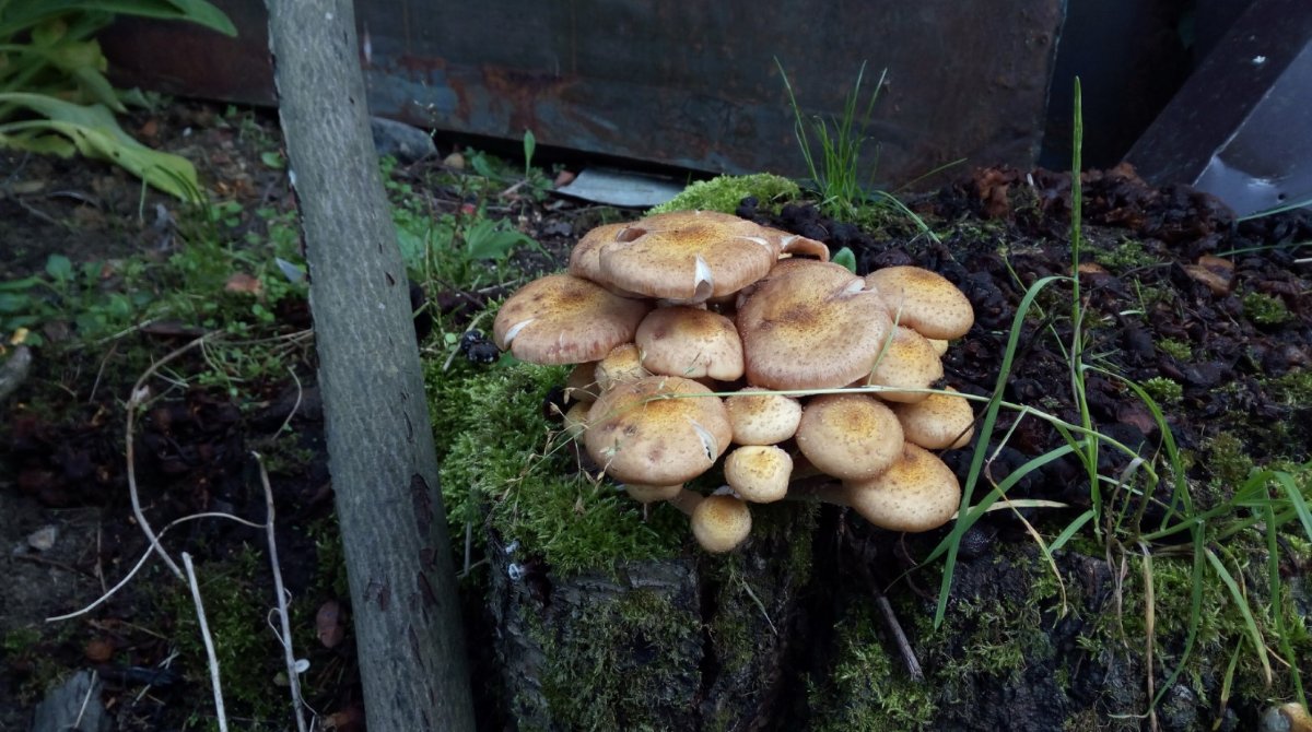Повторилась прошлогодняя ситуация (см. пост за 17 сент.). Приехали на дачу, увидели покрытые опятами пни, за три минуты собрали урожай. Итог - две корзинки