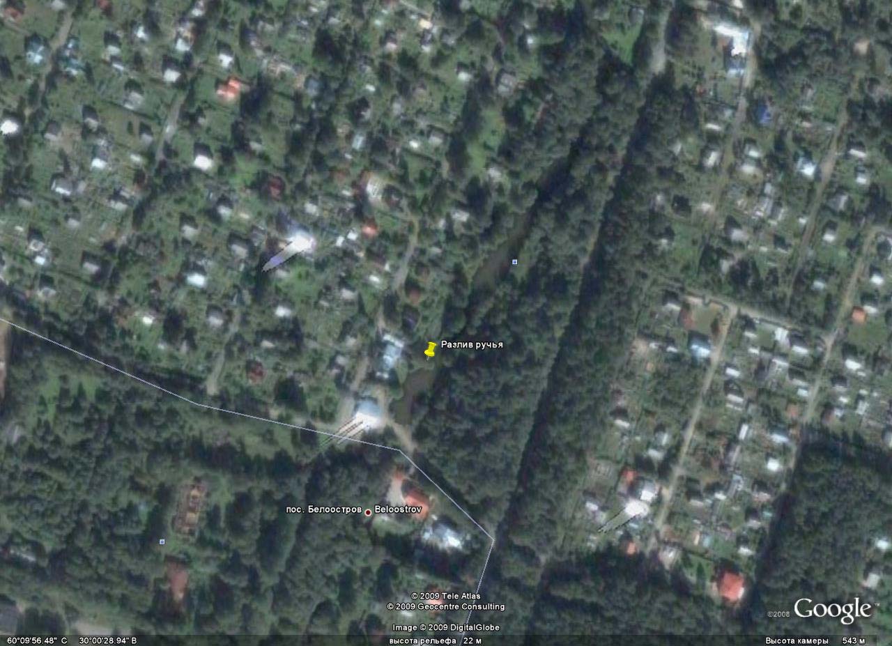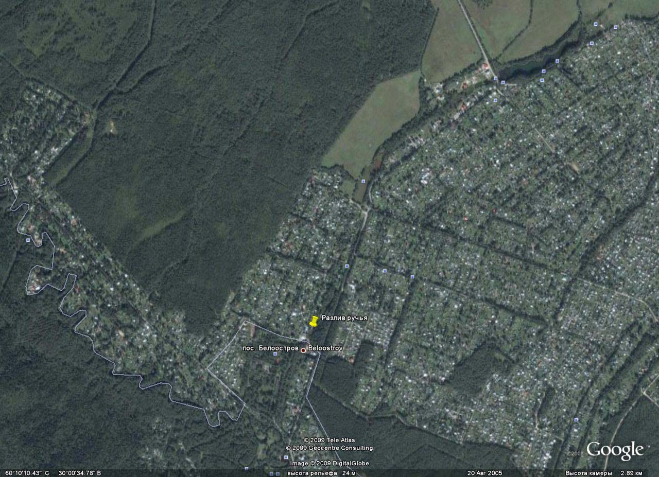 AndreyG писал(а):Сравнил характерные размеры карты (длину прямого участка Ал. шоссе, изгибов Сестры, ...) с ними же на гугловском снимке и пришел к выводу, что данная "канава" должна проходить по границе поселка и леса или чуть отступя от леса. Садоводство, судя по снимку, как раз и вписывается в прежние поля. На самом космоснимке ничего похожего на воду не вижу - видимо это было искусственное русло, которое уже заплыло от времени землей.