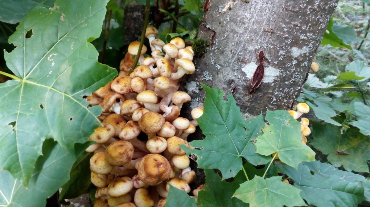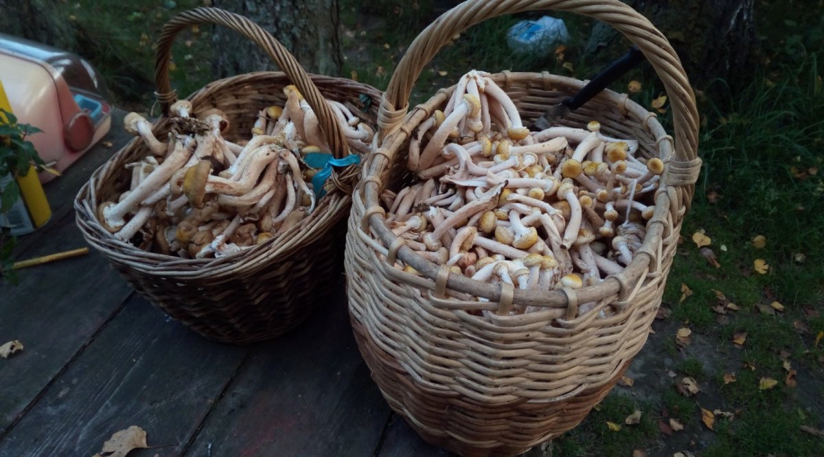 Повторилась прошлогодняя ситуация (см. пост за 17 сент.). Приехали на дачу, увидели покрытые опятами пни, за три минуты собрали урожай. Итог - две корзинки