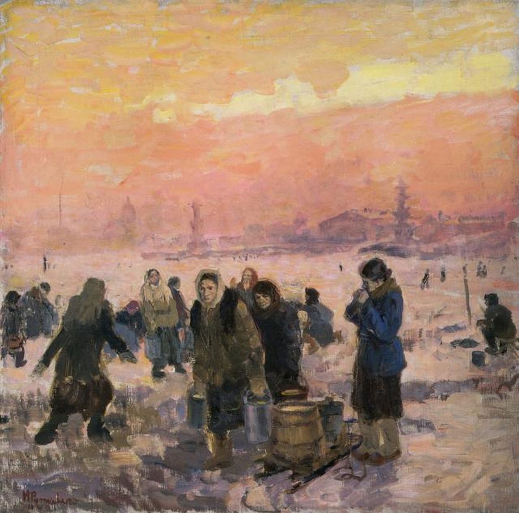 Одна из блокадных картин Н.Х Рутковского. Изображён вид на стрелку Васильевского острова с Мытнинской набережной. Рутковский, как мы знаем, жил неподалёку, на углу Большого пр. ПС и ул.Ленина.Буквоед писал(а):... художник Рутковский Н.Х., расписывавший Белоостровский вокзал. ... Известно, что он работал в блокадном Ленинграде.