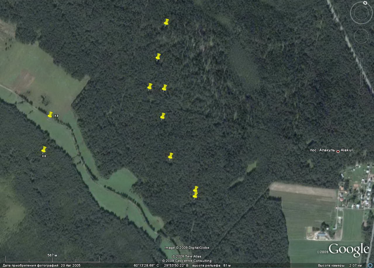 Да, на первом - эти точки я и имел в виду, когда говорил про верхнюю кромку леса. А вот это как вам? От вашего АПК образуется аккуратненькая цепочка.