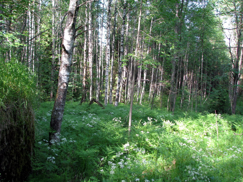 Чем ближе к Сестре, тем противнее лес. Какой-то кустарник среди бурелома. Мелкие болотца с проступающей водой и плавающими лягушками. Комарики кусаются. Да и жара градусов 25. Просека практически неразличима. Не будь жпс - кранты полные. Слышу - впереди кто-то ломится через лес, треща сучьями. Ощущение, что два слона, не меньше. Эхо еще такое... Решил тоже похрустеть - мало ли кто. Может лось, может медведь, а может волчина позорный. На Камчатке по лесу идешь, так специально берешь дрын побольше и давай по деревьям колотить. А то медведь может скушать.