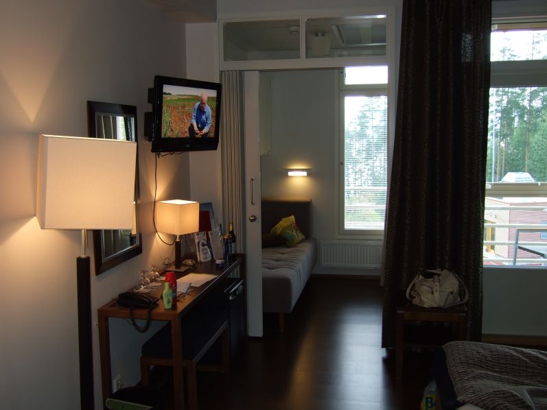 На ресепшене спросили о наличии свободного номера и он быстро нашелся. Так что инетсайты отелей иногда нагло врут. Номер просторный. ТВ с первым каналом, мини-бар с бухлом, балкон со столиком и стульями, кондиционер до +30 градусов, в туалете можно танцевать втроем вприсядку и мыться в душе. Стоимость номера (самого дорогого, кстати) 135 евро. В стоимость входит завтрак за 16 е (шведский стол, полная обжираловка, кормят очень хорошо. Ужин за деньги, те же 16 евро), посещение тренажерного зала и спа-бассейна «скока хошь» (реально выходит три раза, но особо активным можно и больше). Так с улицы бассейн стоит в среднем 14 евро, так что за три раза на двоих экономия в 84 евро. Есть разные терапевтические услуги, боулинг, бильярд, игровые автоматы и однорукие бандиты (в отличие от России. Они есть еще и в каждом большом супермаркете и пользуются большой популярностью). Отель расположен вдали от шума городского, на берегу озера Сайма, недалеко от городского кладбища. Можно заказать круиз по озеру на полтора часа на пароходике за 10 е на рыльце. Вокруг отеля много пеше и велодорожек. Можно собирать грибы-ягоды. Вообще-то основные посетители отеля, как кажется, пожилые финны. Наверное, разные ветеранские организации спонсируют. Сидят они в холле в креслах и обсуждают, наверное, свои боевые действия в районе Старого Белоострова. Знать бы финский, можно спросить, как там было. Недалеко от отеля расположены коттеджи, принадлежащие ему же. Вмещают от 2 до, по-моему, 10 человек. Еще дальше есть кемпинг. Домики маленькие и побольше. Наверное, без света и отопления с удобствами на улице. Но это для летнего сезона, для рыбаков и т.д. И стоят евров 20.