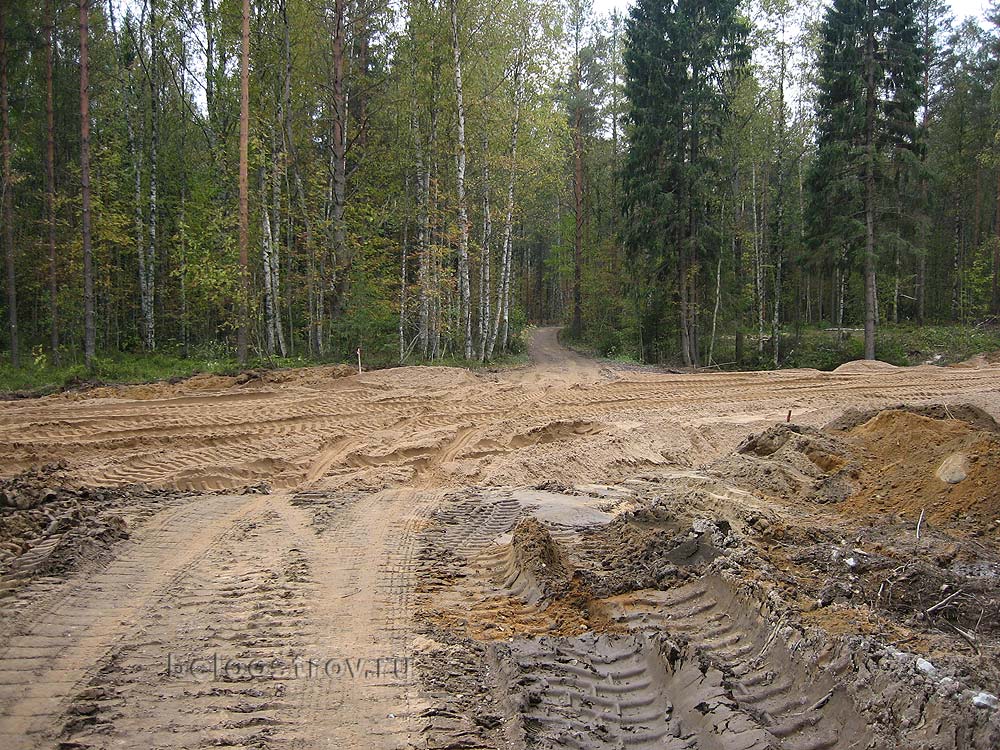 Поначалу я решил, что сия трасса и проложена через искомый перекрёсток, и разумеется, повёл команду направо. В итоге, дошли мы до Камешков, а именно - до Пасторского ручья. Поняв свою ошибку, мы развернули стопы в обратную сторону. Благо, встретился "грибник-ягодник", который уже был знаком с перестройкой сей местности, и указал нам искомый перекрёсток. Он был метрах в 200-х влево по новой трассе от выхода старой дороги на неё. По ходу видели массу карьерных "Volvo" на чудовищных колёсах (пашенная резина КрАЗов - отдыхает), которые ездили как с карьера - с песком - так и обратно - пустые. Жаль, не сфотографировал.