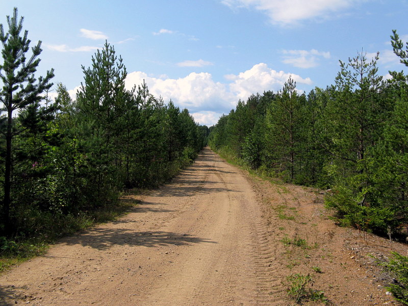 Просека проходит мимо Нахтоловского озера. Но мы с 1-й танковой дороги свернули на дорогу, которая идёт в гору к нефтепроводу через высокий лес. А там через нефтепровод и через лес прошли на 2-ю танковую. Можно идти и дальше по "нахтоловской" просеке, она как раз выводит к Лампиярви, но там в одном месте просека теряется и приходится идти через тёмный буреломный и заболоченный лес по навигатору.