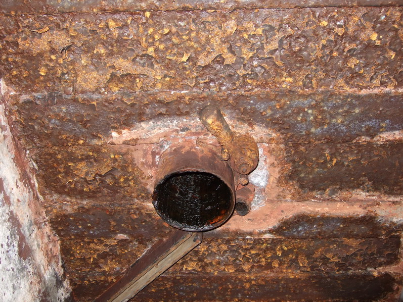 Это еще одно фото внутри дота. Вид на трубу перископа. Рядом рукоятка, которой с помощью привода изнутри закрывалась наружная броневая крышка
