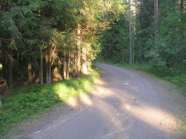Вышли мы на дорогу к Витриярви с "озерного шоссе" - с асфальтированной дороги, ведущей от Выборгского ш. к Пасторскому озеру. Миновав "железнодорожный" магазин (который, кстати говоря, после смерти его основной хозяйки работал из рук вон плохо, а сейчас уже и вообще не работает), прошли метров 100 и свернули влево на хорошую грунтовую дорогу, рядом с которой раньше стояли скамеечки на пнях - сейчас скамеечек и пней не осталось,но в своё время этот район и был назван "пеньки". По этому топониму аналогично назвали и кафе-ларёк на развилке "Пасторское-Камешки".