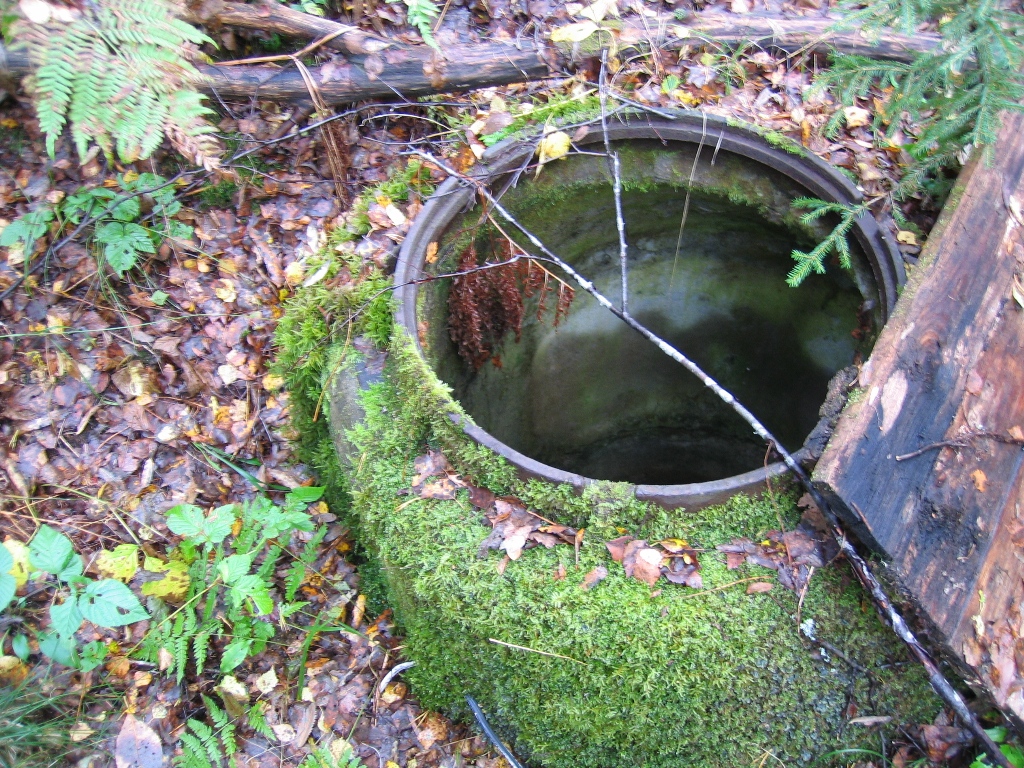 Если идти от нашего памятника (бронещитка) по просеке в сторону Чайки, то выходишь сначала на поляну с какими-то цементно-кирпичными россыпями, похожую на заросшую свалку. Далее упираемся в косую дренажную канаву. Идём вдоль неё к Чайке и натыкаемся на 2 таких люка-колодца. Один недоходя, а второй - у самого чайкиного забора.