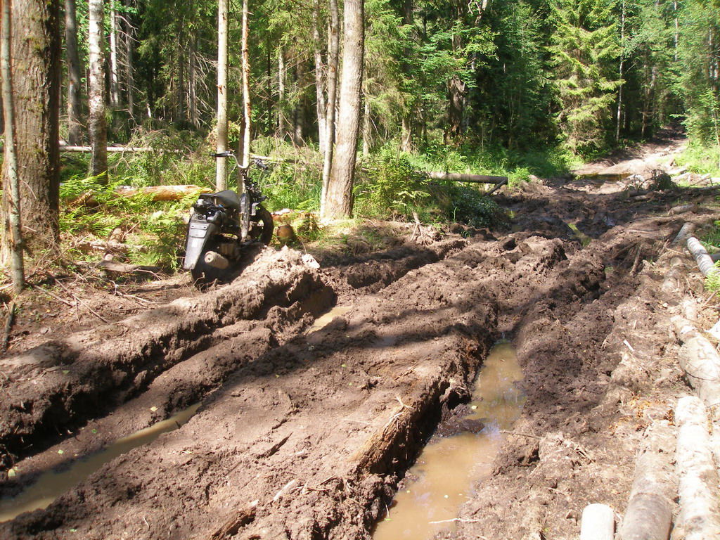Наверно так и придётся поехать. После того, что мотороллер пережил, эту дорогу он точно осилит. Но на руках его переносить в любом случае местами придётся. А со стороны СНТ "Светлая гора" дорога в таком-же состоянии, как и между танковыми дорогами?