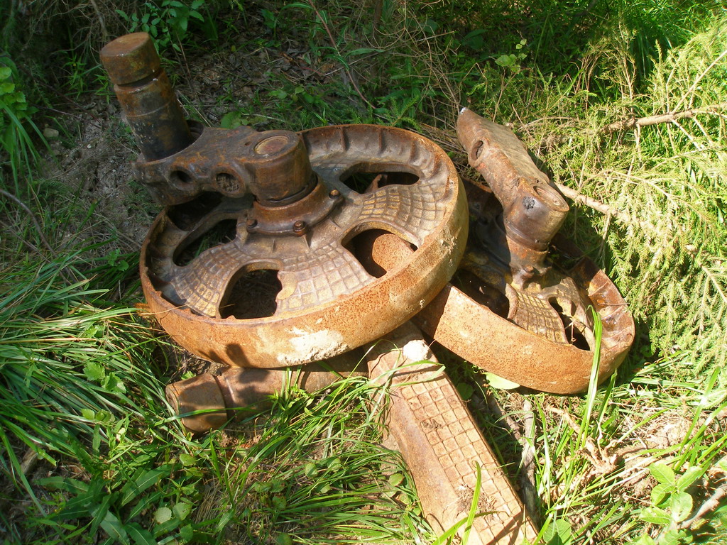 Мост порушен и давно, брёвна замшелые и трухлявые, перейти можно, но с опаской. Правда, видны следы квадроциклов. Как они там перебирались? Вероятно, вброд слева. Перед мостом - останки Жигулей. Ощущение, что кто-то там перевернулся.