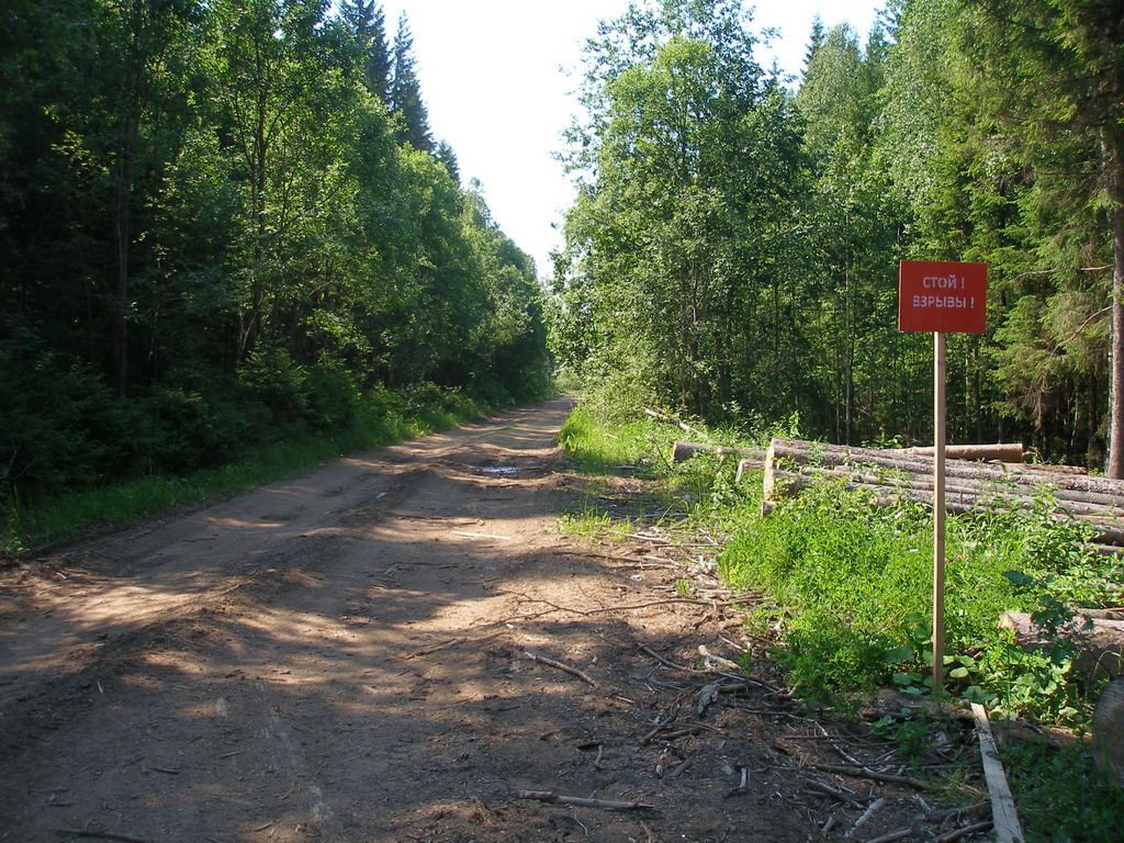 За разливом на развилке в Термолово, налево висит табличка, предупреждающая о взрывах.