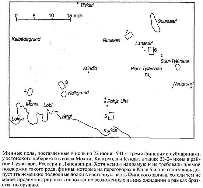 Германский военно-морской атташе фон Бонин отметил 22 июня 1941 г. в своем дневнике: "Находившиеся сегодня в Финском заливе на задании финские подводные лодки получили разрешение командующего военно-морских сил наносить удары, если им попадутся в высшей мере достойные цели (линкоры!) или возникнут очень благоприятные возможности для атаки". В целях сохранения тайны экипажам возвратившихся с задания подводных лодок (минирование эстонского побережья) было отказано в предоставлении отпуска, их держали в карантине до того момента, пока Финляндия не вступила в войну против Советского Союза. Вся документация о поставленных минных полях была оформлена только 26 июня 1941 г., т.е. с началом войны. В ходе второго рейда подводных лодок 23-24 июня два минных поля были поставлены к западу от острова Суурсаари.