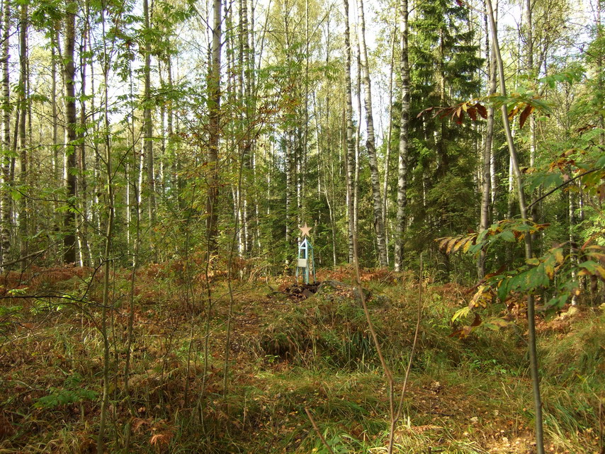 Ходил сегодня по лесам Белоостровщины. Нашел-таки этот памятник танкистам. Находится на небольшом естественном возвышении прямо на первой линии финских окопов. Так что расположение финского дзота было очень правильным. Сзади дзота находится глубокий овраг - хорошее место пережидать обстрелы. Взять там можно только из миномета.