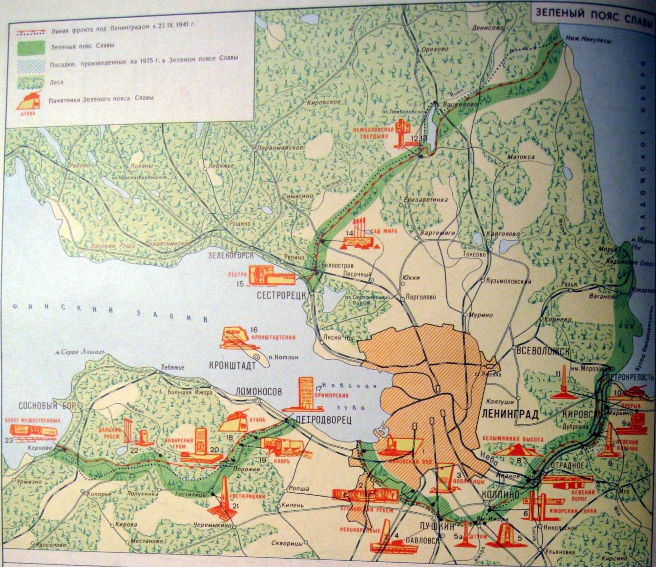 Памятник был. Находился на месте заправки у развилки Сестрорецк-Белоостров-Зеленогорск. Простоял недолго. Был убран, т.к. получилось что памятник был установлен ЗА бывшей линией фронта. Поскольку он есть на карте http://www.aroundspb.ru/maps/lo1979/glory.jpg , то могу предположить что лет пять точно простоял. Прядставлял собой, то что изображено на вышеприведённой карте - на небольшой насыпи прямоугольный камень, вроде бы даже без надписей. Фото в природе существует - на наборе отрыток посвященному "Зелёному поясу Славы".