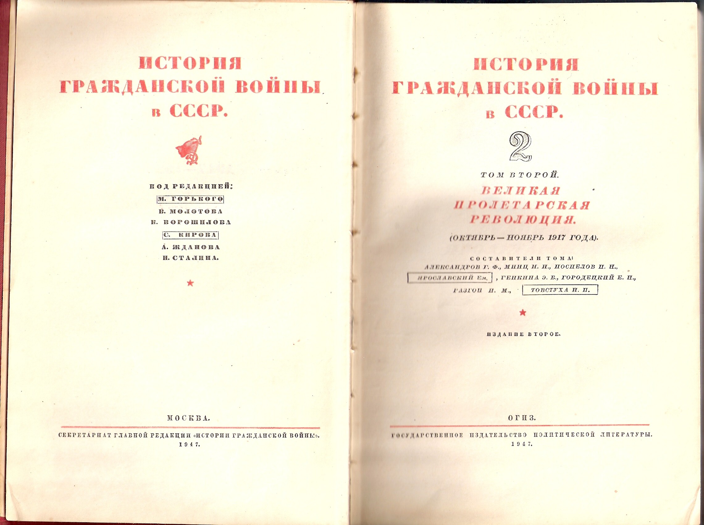 Обозначено 8 редакторов, причём иерархия непростая: первым - великий пролетарский писатель, последним - великий вождь и учитель. Писали и редактировали, видимо, не один год - успел погибнуть Киров и помереть Горький. Две фамилии старательно замараны тушью. Это, как выяснил, Бубнов и Гамарник. А вот список составителей тома библиотекари (книжка-то библиотечная) то ли не успевали замарывать, то ли не довели до них, то ли книжку кто-то замотал. С другой стороны, если бы замарали, то из 18 составителей остались бы на бумаге - 4, а "по жизни", с учётом почивших своей смертью Горького и Товстухи, только 2: Мануильский и Минц. Как-то маловато для такого солидного издания. Кстати, последние дожили до глубоких седин. Остальные 13 закончили свой путь в 1937-38 гг + 1 (М.И.Кубанин) в порядке исключения, но по аналогичной причине- в 1941.