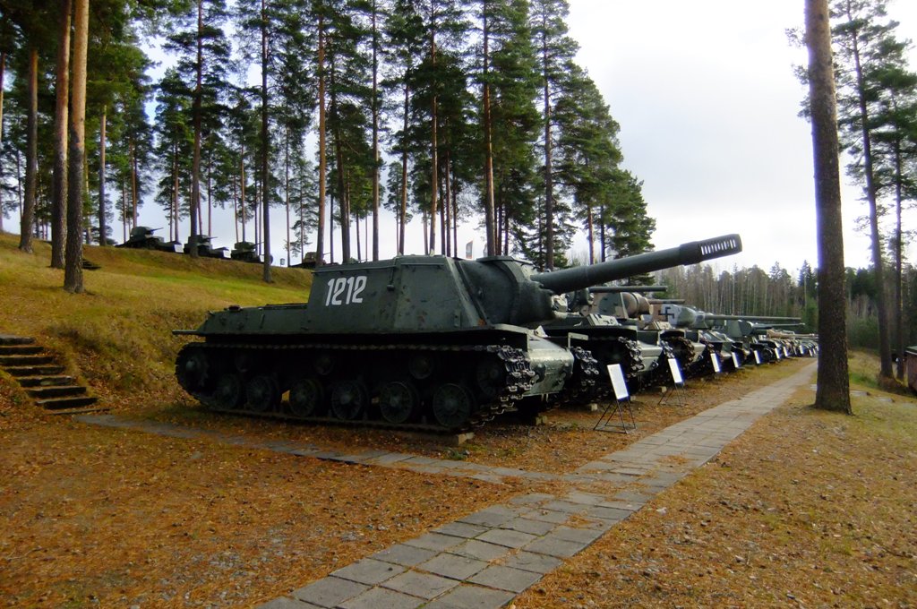Внешняя экспозиция. На переднем плане - ИСУ-152 (одна из 2-х, захваченных на Перешейке). Служила в войну, правда, уже не пушкой, а тягачом. Вооружённая 20-мм ПТР, прослужила до 1964 г. Родную пушку установили уже в музее.