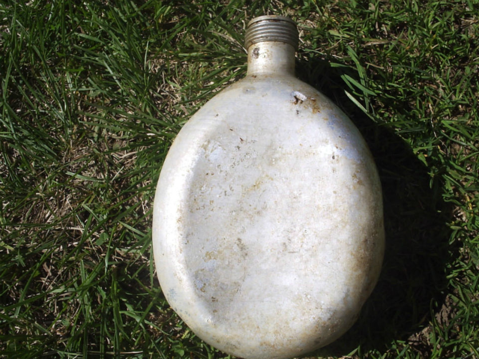 Мне такая же фляжка досталась от деда, а ему от убитого однополчанина. На ней год нацарапан 1944, инициалы и рожица.