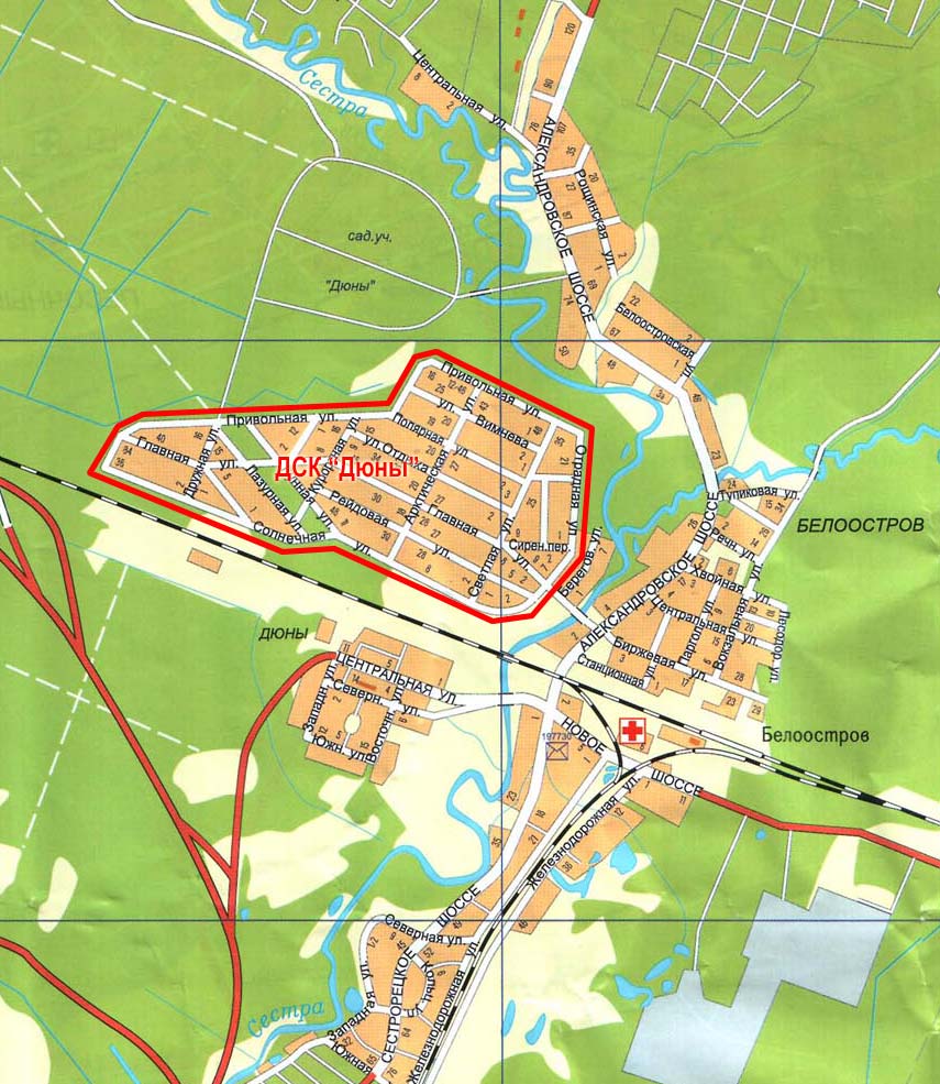 А суть темы - Дачно-Строительный Кооператив (ДСК) "Дюны" в Белоострове - вот он, на карте. Наш уважаемый краевед эксперт - М.А.Логунцов как раз там и проживает.