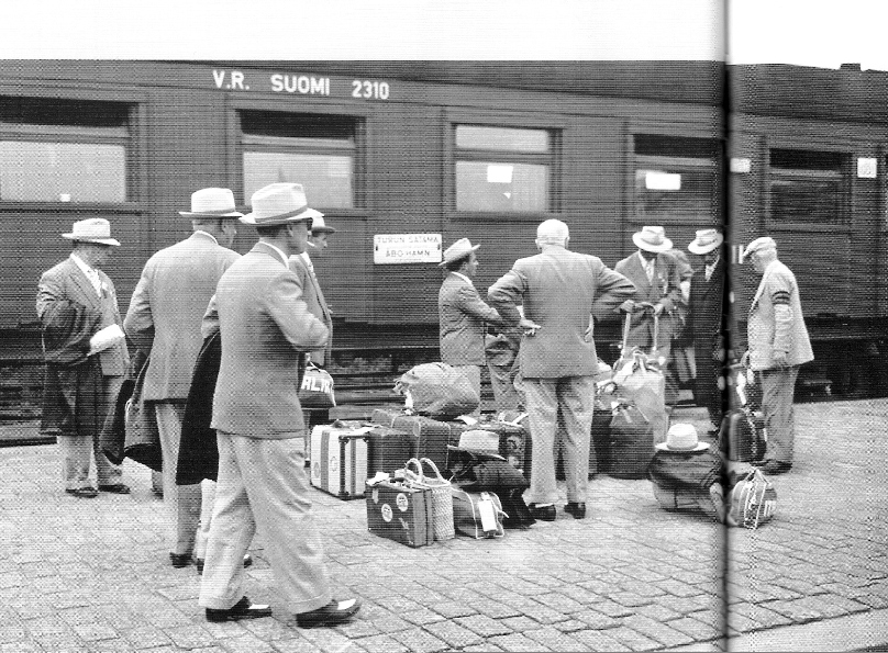 Участники олимпиады в Хельсинки. На вагоне видны пазы для крепления щитов.