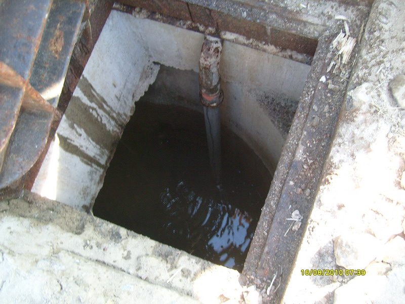 При вскрытии крышки показался колодец из бетонных колец, имеющих внутренний диаметр около 1,5м и заполненный водой. Глубина колодца от крышки люка составила около 6м