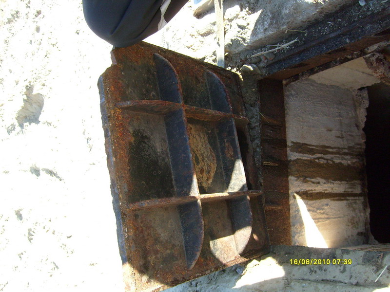 При планировке местности тяжелой техникой в средней части здания (с башенками) был сдвинут железный лист 1м x 1м, толщ. 1-1,5 мм. Под ним находилась цементная стяжка толщ. около 100мм. Ниже находился деревянный щит из обрезных досок толщ. 50мм и шир. 125мм и имеющий размеры в плане 0,6м x 0,6м. Ниже него тяжелый чугунный люк с крышкой 510мм x 510мм x 65мм. Толщ. верхней стенки люка 16мм. Масса около 50кг. На крышке клеймо изготовителя HOGFORS BRUK. Высота шрифта 20мм. (см. www.hogfors.se)