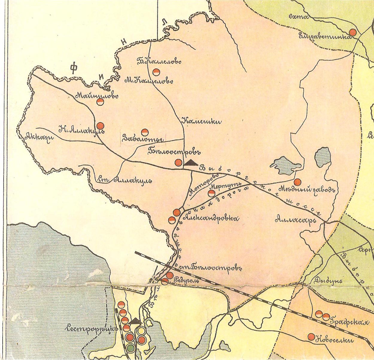 Если взглянуть на эту карту, то можно много чего интересного увидеть. Например, что пограничный пост в 1913 году находился на дороге к Тапкину, а не на дороге в Тонтери.