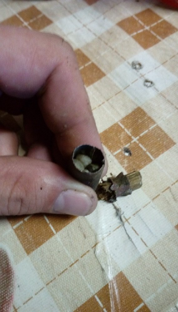 Добрый день. Это лето не богато на выезды, но находки присутствуют. В лесу фоткаем мало, да и не за фотками катаемся. Монеты присутствуют в количестве. 1 выезд=2 монетки в среднем. Но бывает попадается непонятные штуки. В выходные поднял гильзу от мосинки, была заткнута деревяшкой, а со стороны капсуля смята(не догодался сфоткать). Внутри оказались камешки, белые, типа как кремешки, что по детству в ручейках все собирали. Фото прилагаю. За качество извиняйте
