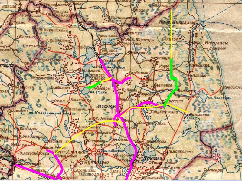 "Нет, не для подвоза боеприпасов она была построена. Посмотрите ее начало на крупной карте, на участке от Левашово до Сертолово - там она извивается чуть ли не восьмерками, давая возможность поставить тяжелый жд транспортер в любом направлении и стрелять вдоль путей (чтоб не опрокинулся). Или подвести его почти к Мертути, прикрыв полосу основной линии КаУРа до Елизаветинки."