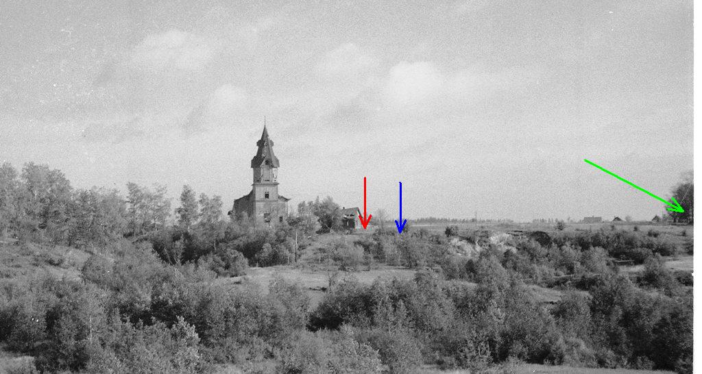 Разглядывая архивные снимки, я подумал, что снимали все-таки не от этих пней. Пни находятся слишком близко к кирхе. Нужные пни должны быть где-то ближе к шоссе. Да и не было в то время в этом месте подходящих деревьев, если посмотреть на перспективный снимок кирхи издалека. На нём я красненькой стрелочкой отметил лиственницу, синенькой - старушкины пни, а зелененькой - предполагаемое место, откуда снимали финских солдат.