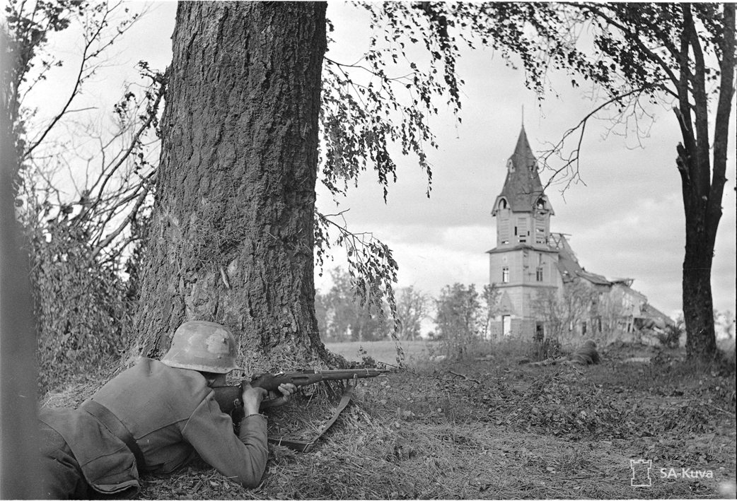 Снимок сделан, похоже, с поля из-за Пасторского ручья. Дата съёмки и автор, к сожалению, не указаны. Но с большой вероятностью можно предположить, что это, возможно, один из первых снимков, ещё до первого захвата этой части Старого Белоострова (04.09.1941). В пользу этой версии говорит тот факт, что снимок сделан издалека (в отличие от известных нам постановочных снимков 19.09.1941).