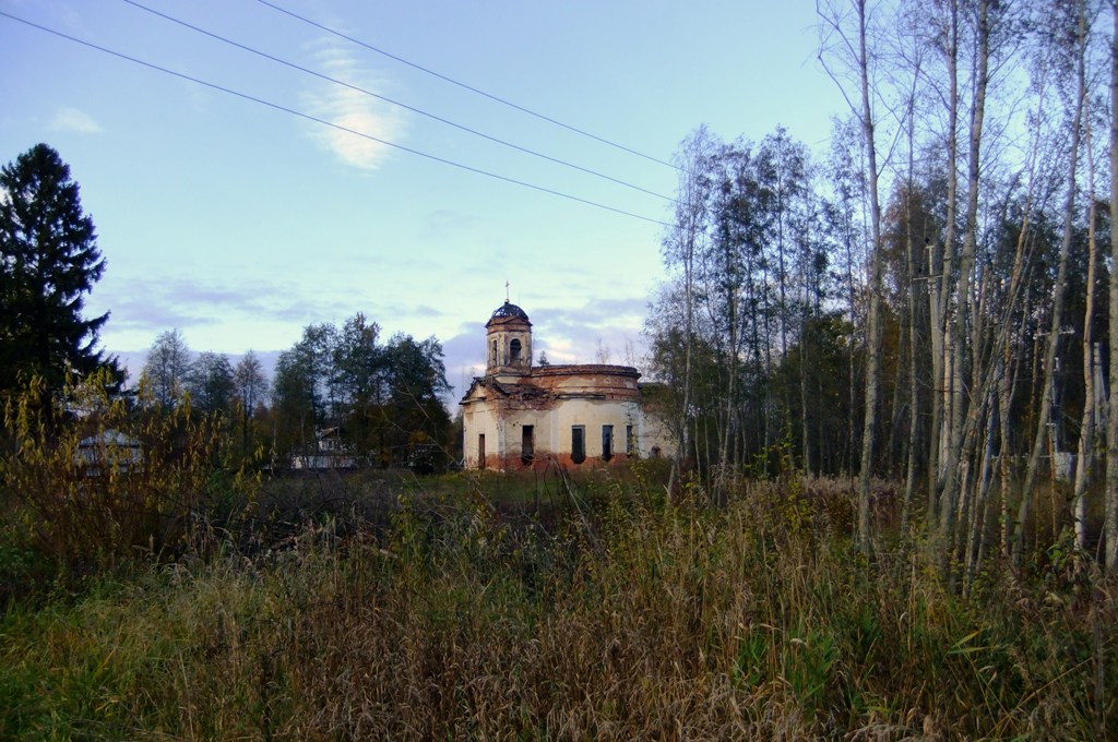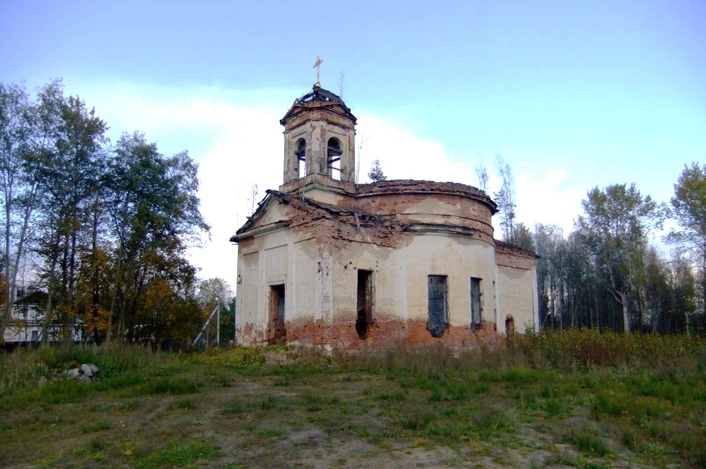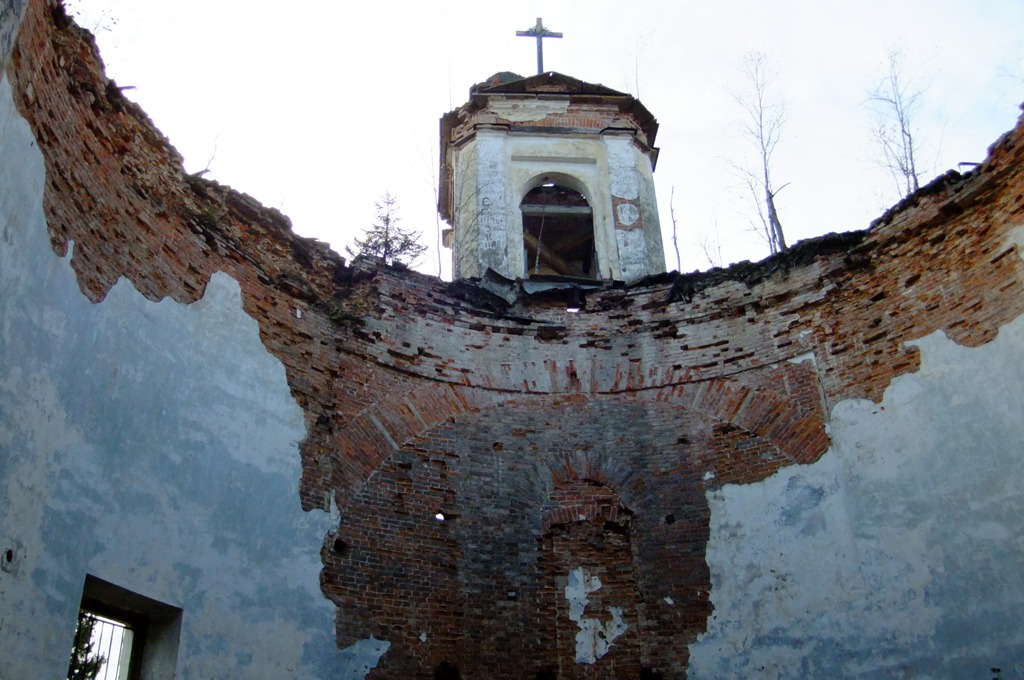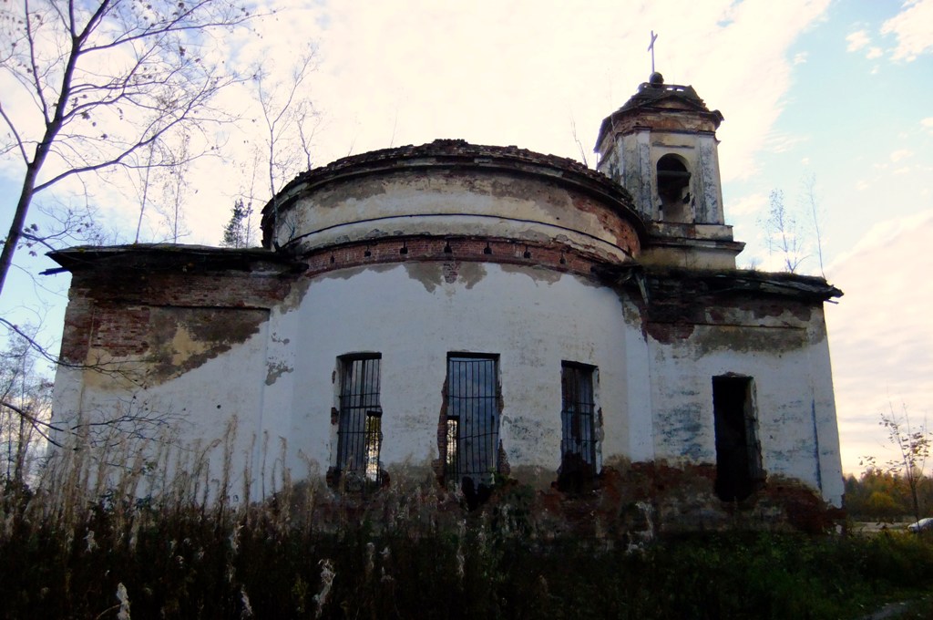 В войну в церкви находилась ремонтная база, где починяли машины, работавшие на Дороге жизни. Слава Богу, уцелела во все лихие времена, но заброшена.
