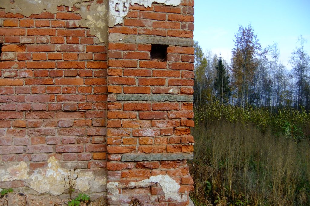 Выемки в стене под окнами служили для установки балок, на которых когда-то лежал пол. Обломки балок валяются кое-где. Похоже пол был каменный, выложенный плитами, добытыми неподалёку, в Путилово.