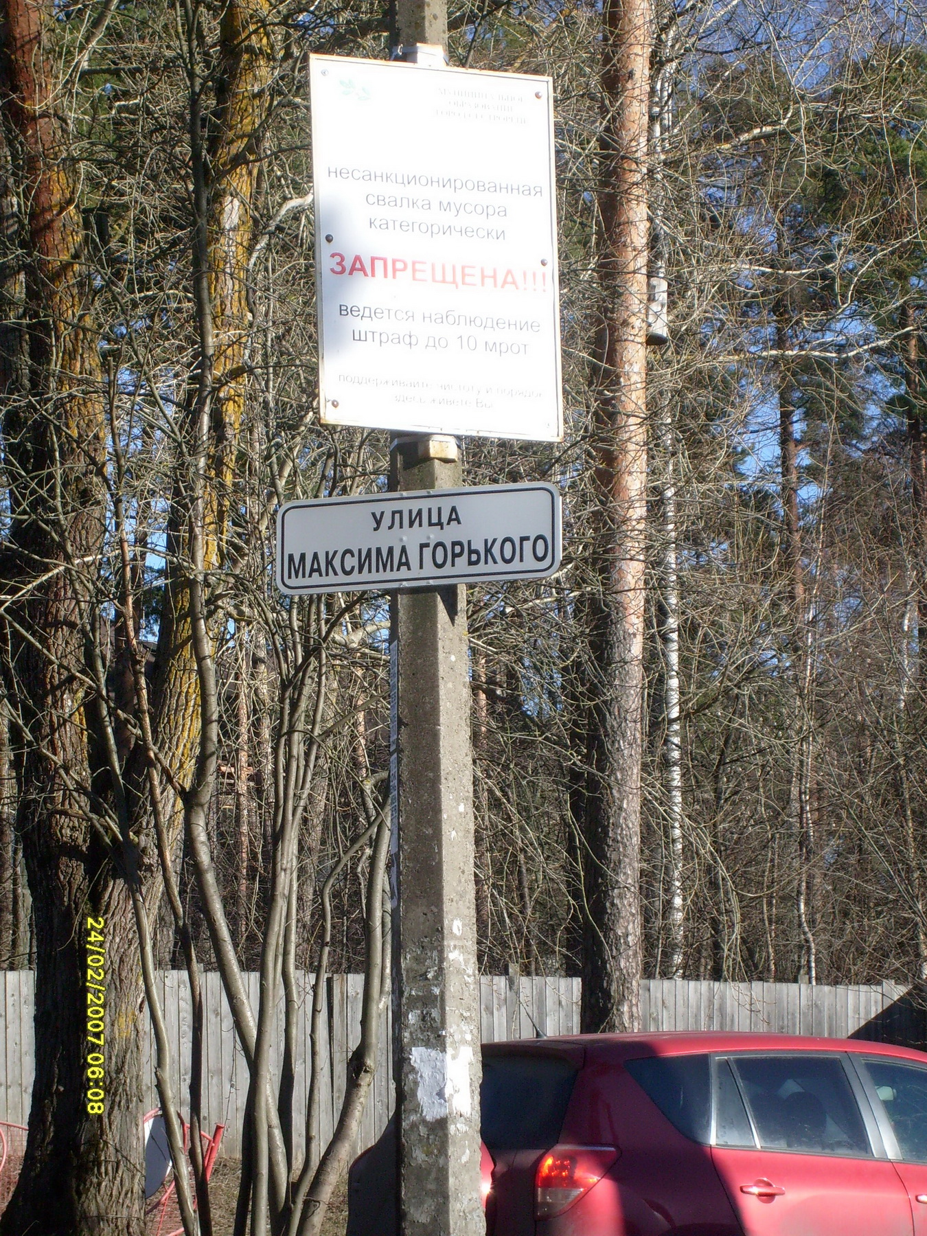 26 марта осматривая дома и таблички с номерами домов я пришел к выводу, что улица находится напротив станции. На это же указывала дорожная табличка с названием улицы, помещенная на фонарном столбе у центрального входа с санаторий Курорта. В Яндексе набрал "Сестрорецк ул. Максима Горького" и на карте Сестрорецка увидел две названные улицы.