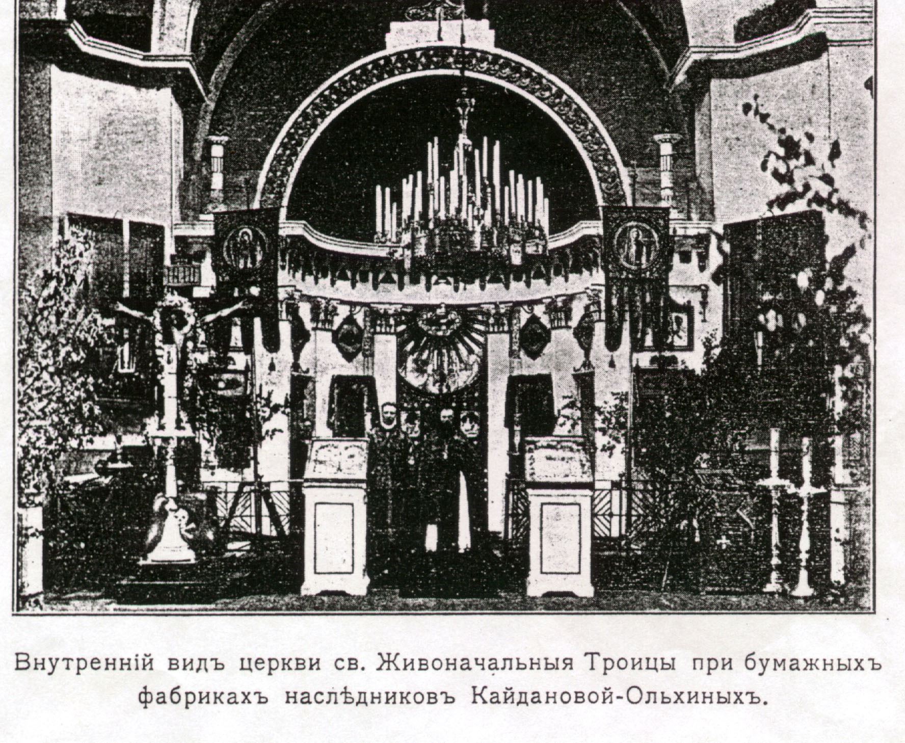 Еще один вариант. В официальном издании о церквях и храмах СПб епархии от 1909 г. церковь называется "Св. Живоначальной Троицы при бумажных фабриках наследников Кайдановой-Ольхиных".