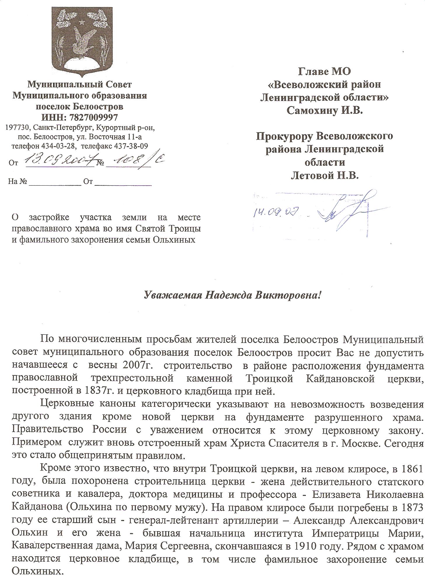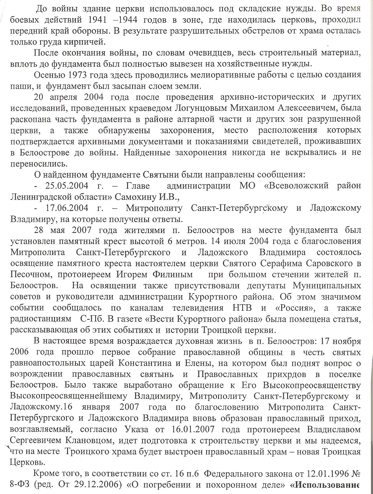 В мае 2007г. прямо по центру фундамента церкви, рядом с памятным 6-ти метровым крестом,установленным и освященным в 2004 г.,проложили забор. Об этом неприятном известии мне сообщили местные жители, дома которых расположены недалеко от фундамента. Пришлось бросить все свои дела и пытаться отстоять церковь. В данной ситуации я был похож на маленького ребенка, у которого большие дяди отняли любимую игрушку. Был составлен большой пакет документов по церкви и передан в администрацию МО и прокурору Всеволожска. Здесь было явное нарушение Федерального закона №8-ФЗ от 12. 01.1996 (ред. от 29.12.2006) "О погребении и похоронном деле". Также с моей стороны было предложено администрации Всеволожска признать место расположения святыни историческим памятником регионального значения.