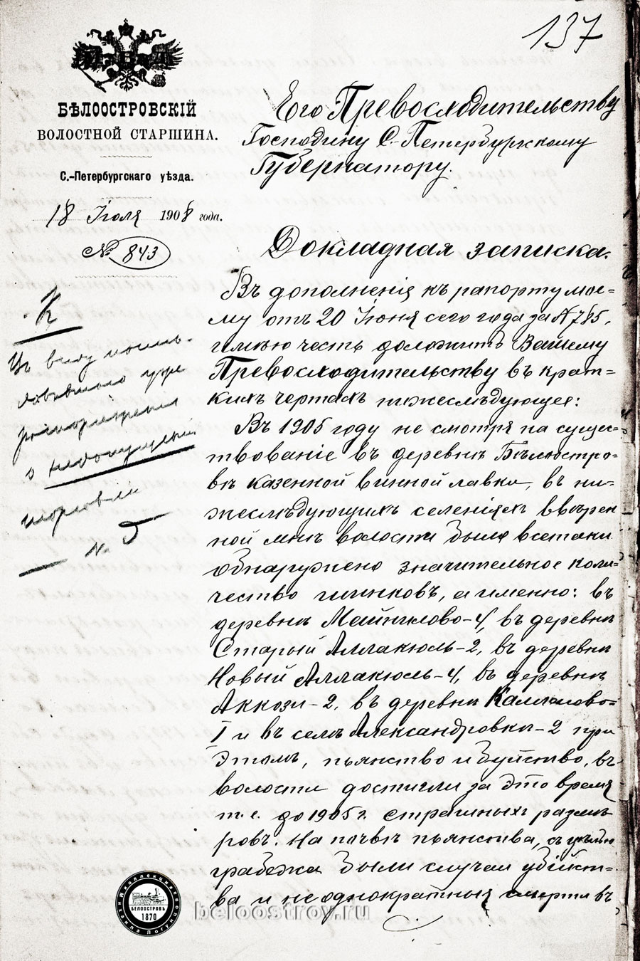 (* В дополнении к данному рапорту Йороне направил Губернатору СПб докладную записку от 18 июля 1908 года: