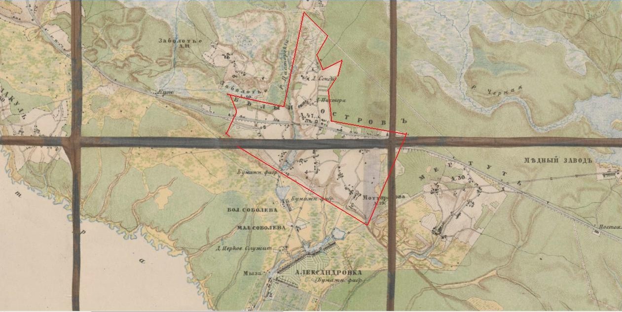 Хотя не совсем об этом. Вы обвели территории, выделенные на карте светлым цветом. Такие же пятна существуют и вокруг соседних поселений (кроме Александровки, как ни странно), и обозначают, скорее всего, распаханные поля. Понятно, что там лес вырублен, а болота осушены. Этим любой населенный пункт отличается от окружающего леса.